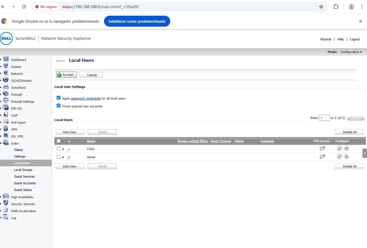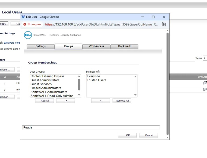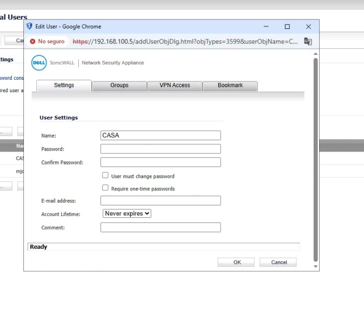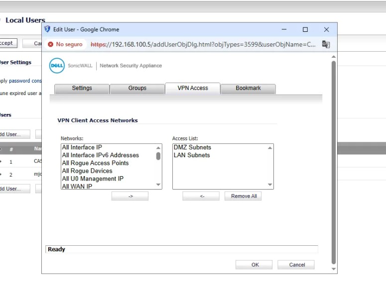 Para configurar una VPN en el SONICWALL para acceder a Sabadell: Conectarse a: 192.168.100.5 «SonicWall» Usuario: admin Contraseña: password Users Local Users Add User Copiar la configuración que aparece en las capturas.